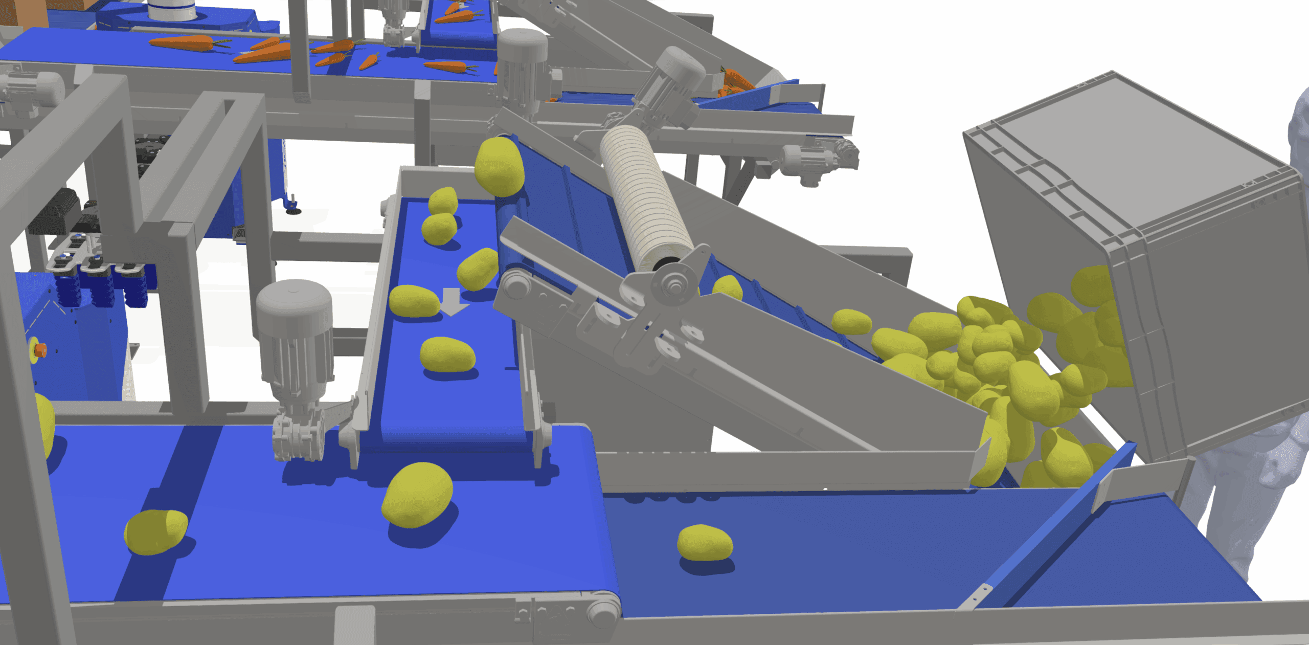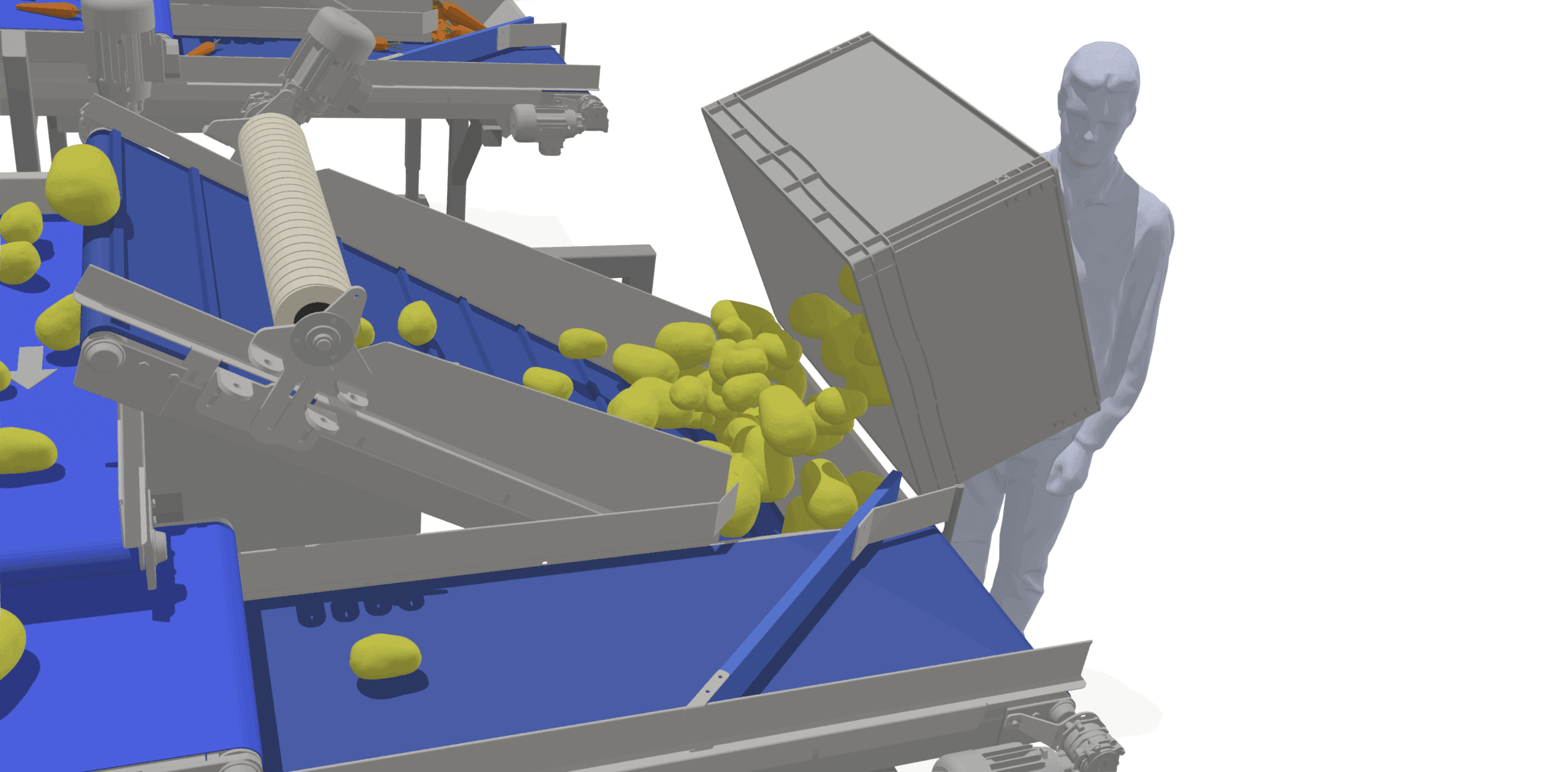 The operator places fresh food onto the diagonal conveyor belt.