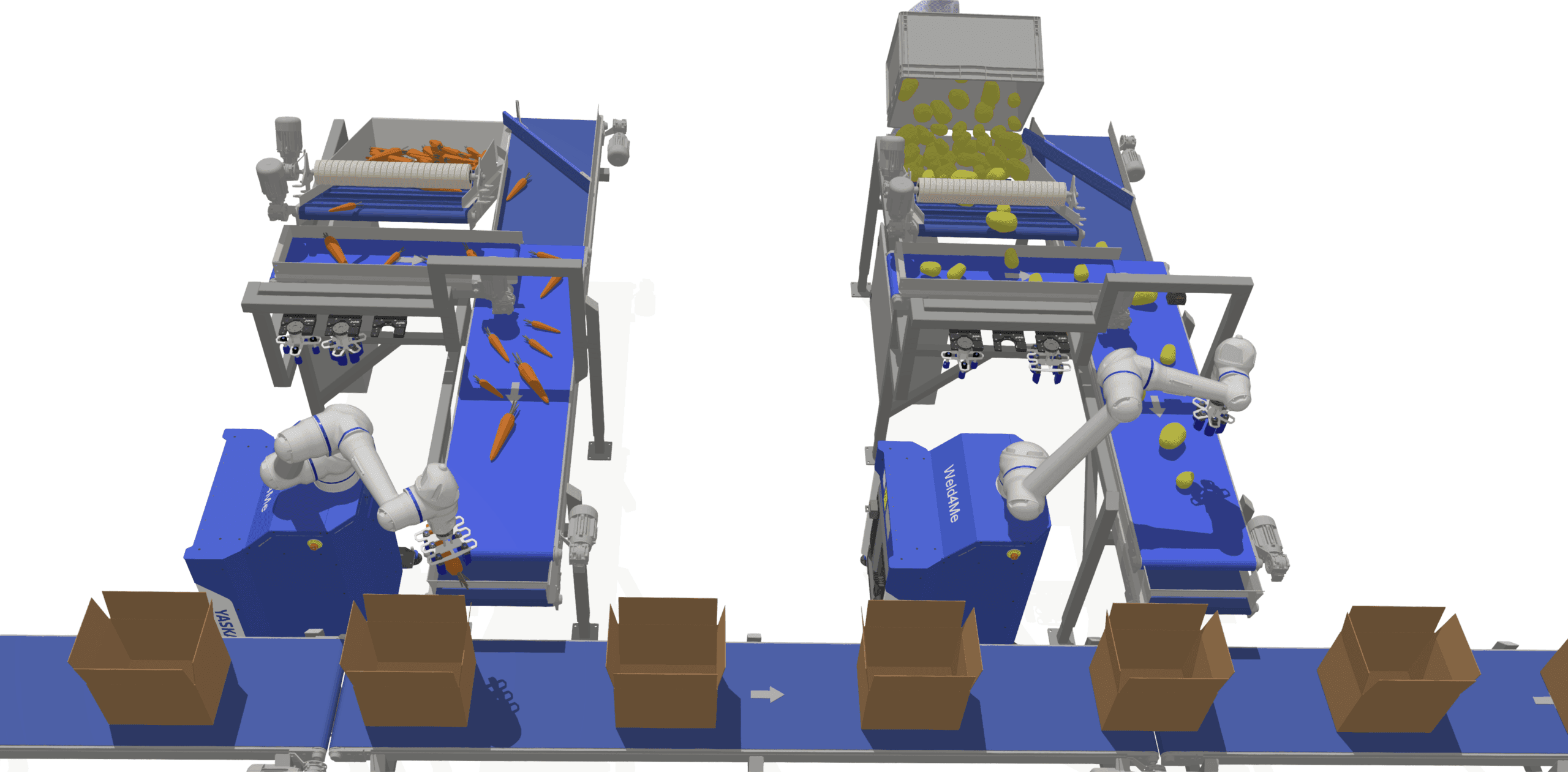 The robotic arm places the fruit or vegetable into the correct box.